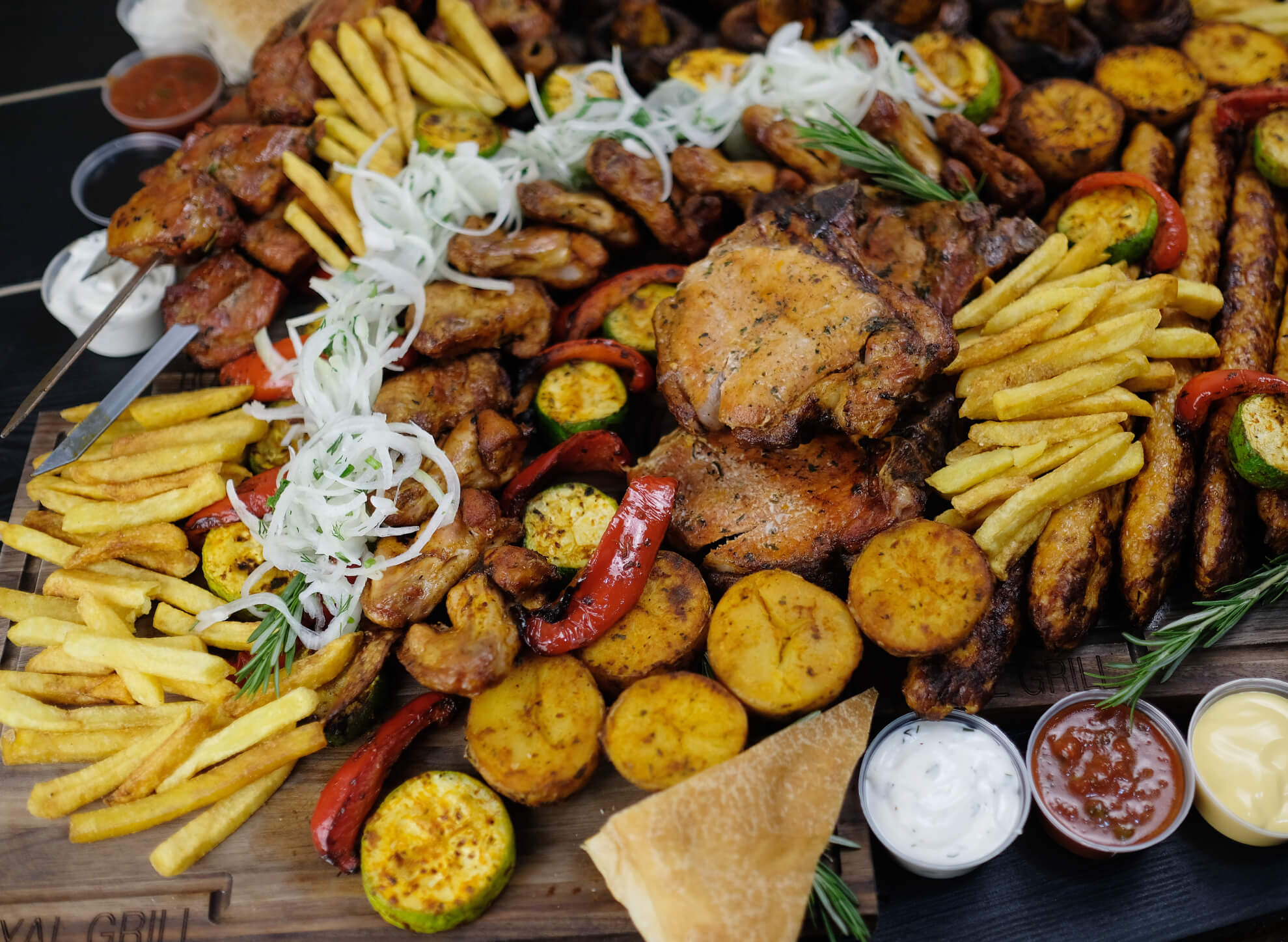 Крылья кур. на гриле – 2 порц., Голень кур. на гриле – 2 порц., Свинина шея – 4 кг., Антрекот свиной на гриле – 1 кг., Ребра свиные на гриле – 1 кг., Люля кебаб куриный – 4 порц., Люля кебаб говяжий – 4 порц., Овощ. ассорти на гриле – 8 порц., Шампиньоны на гриле – 8 порц., Картофель на гриле – 8 порц., Картофель фри 120гр – 8 порц., Лепешка – 8 шт, Лаваш – 8 шт, Соусы на выбор – 16 шт.
