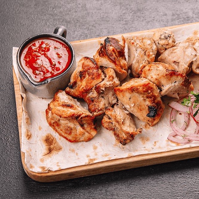 Шашлык (куриная мякоть) — это нежные и сочные кусочки куриной мякоти, обжаренные до золотистой корочки на гриле. Мясо сохраняет свою мягкость и сочность, а специи придают блюду насыщенный и ароматный вкус. Этот шашлык идеально подходит для сытного перекуса или основного блюда, гармонично сочетаясь с соусами и овощами.