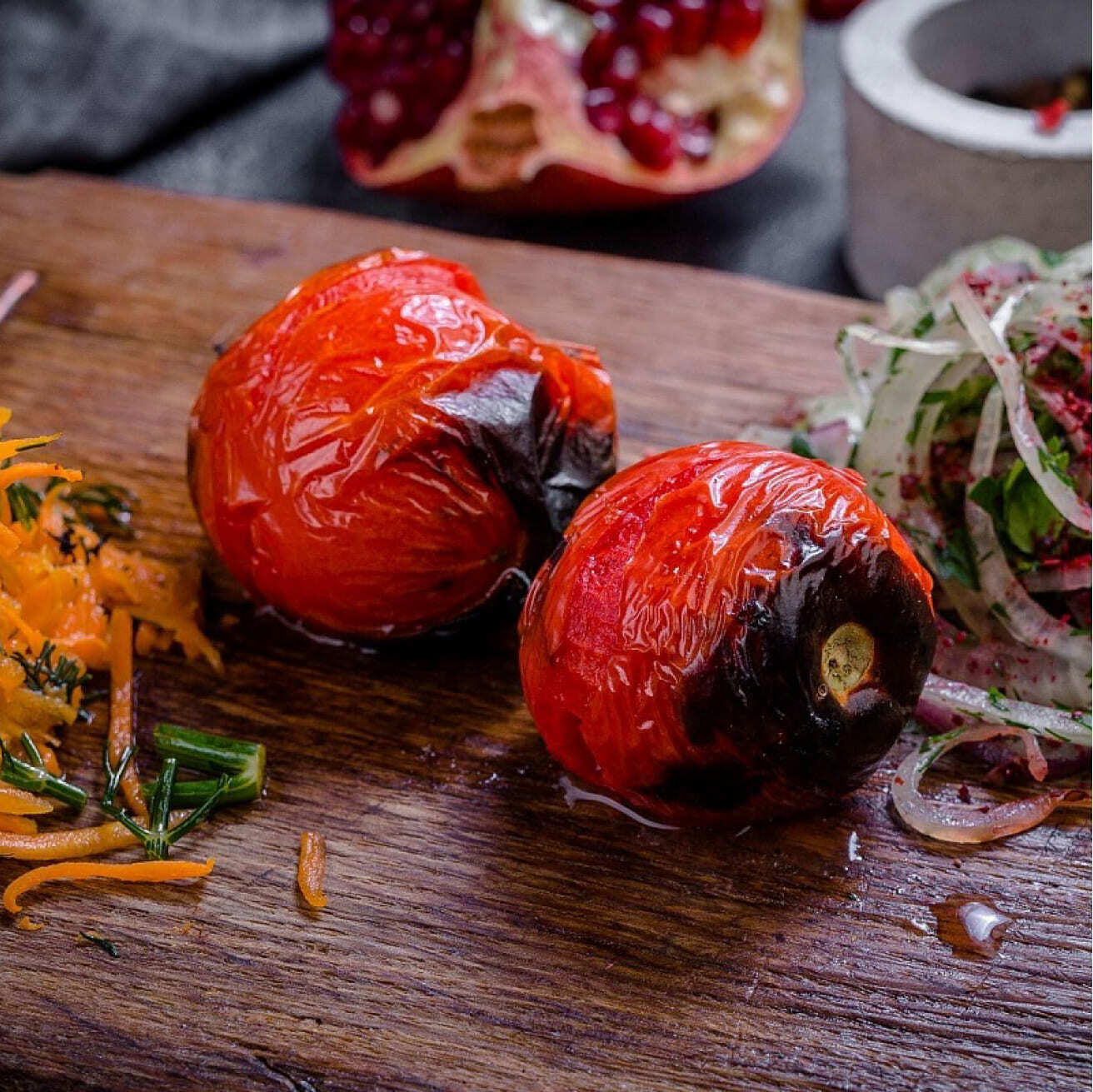 Помидор на гриле — это сочные помидоры, обжаренные до мягкости с характерными полосками от решётки. Лёгкая карамелизация придаёт помидорам глубину вкуса, сохраняя их свежесть и натуральную сладость. Идеально подходит в качестве гарнира или дополнения к мясным блюдам, бургерам и денерам.